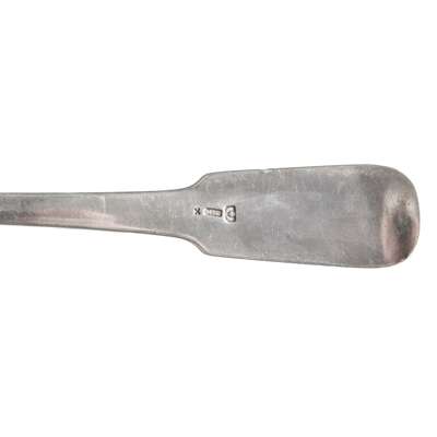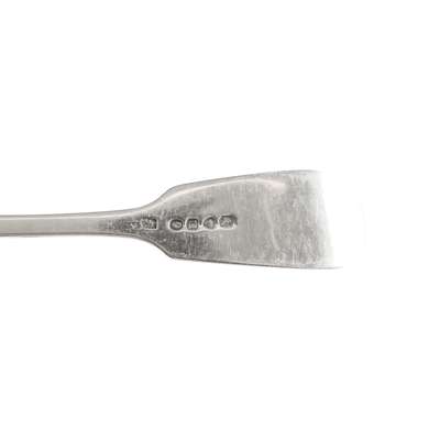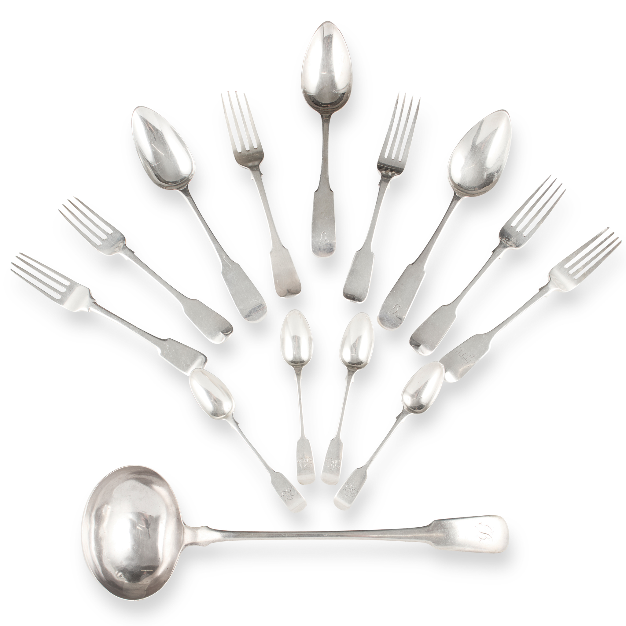 Marked cross, M&C, thistle, of Fiddle pattern, italic B to terminal; together with a table fork, William Jamieson of Aberdeen, marked WJ, ABD, WJ, of Fiddle pattern, engraved initials to terminal and another George Jamieson of Aberdeen, marked GJ ABDn, London hallmarks and a collection of four table forks, Edinburgh and London; together with a matched set of three tablespoons, Edinburgh and four teaspoons, SS, London 1875, of Fiddle pattern, engraved initials to terminal (14)