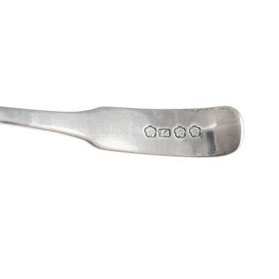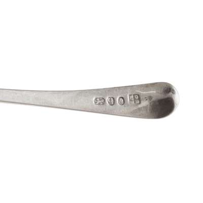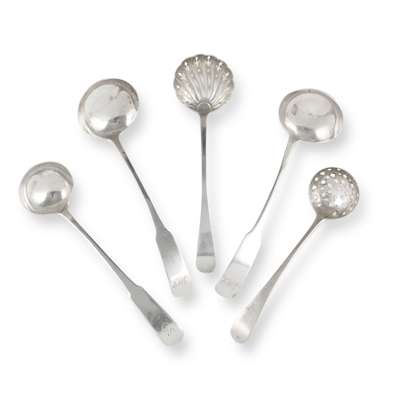 Marked rose twice, PL, rose, of Fiddle pattern, JMCK engraved to terminal; together with another, William Mill of Montrose, marked WM, rose, WM, rose, WM, of Fiddle pattern and a sugar sifter, Cameron of Dundee, marked CAM/ERON, C, thistle pot of lilies, DUN/DEE, of Old English pattern, and another, London, of Old English pattern (5)