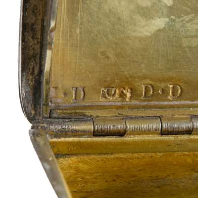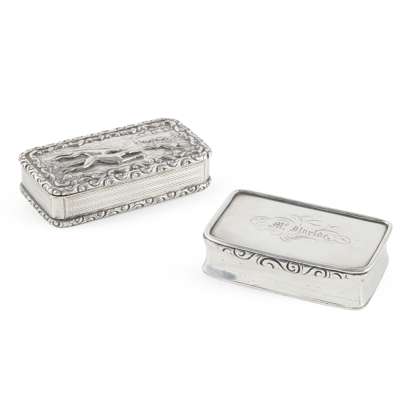 Marked DD, thistle, ** S, D.D. (incuse), of rounded rectangular outline, engraved to the lid with foliate thumbpiece; together with another Taylor & Perry, Birmingham 1830, of rounded rectangular outline, engine turned detail to the sides, the repoussé lid depicting a hare coursing event, engraved to the interior lid crest and motto for the Clerk of Penicuik family, ‘To James Clerk Esq…' (2)