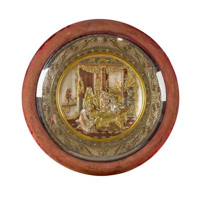 Of circular outline, decorated with a Neoclassical scene depicting ‘A Pompeian Lady’ reclining on her couch with her three handmaidens, signed and dated 'Morel-Ladeuil, inv Fecit 1876', registration mark, all within a decorative border on a black, contained in its original convex glazed frame