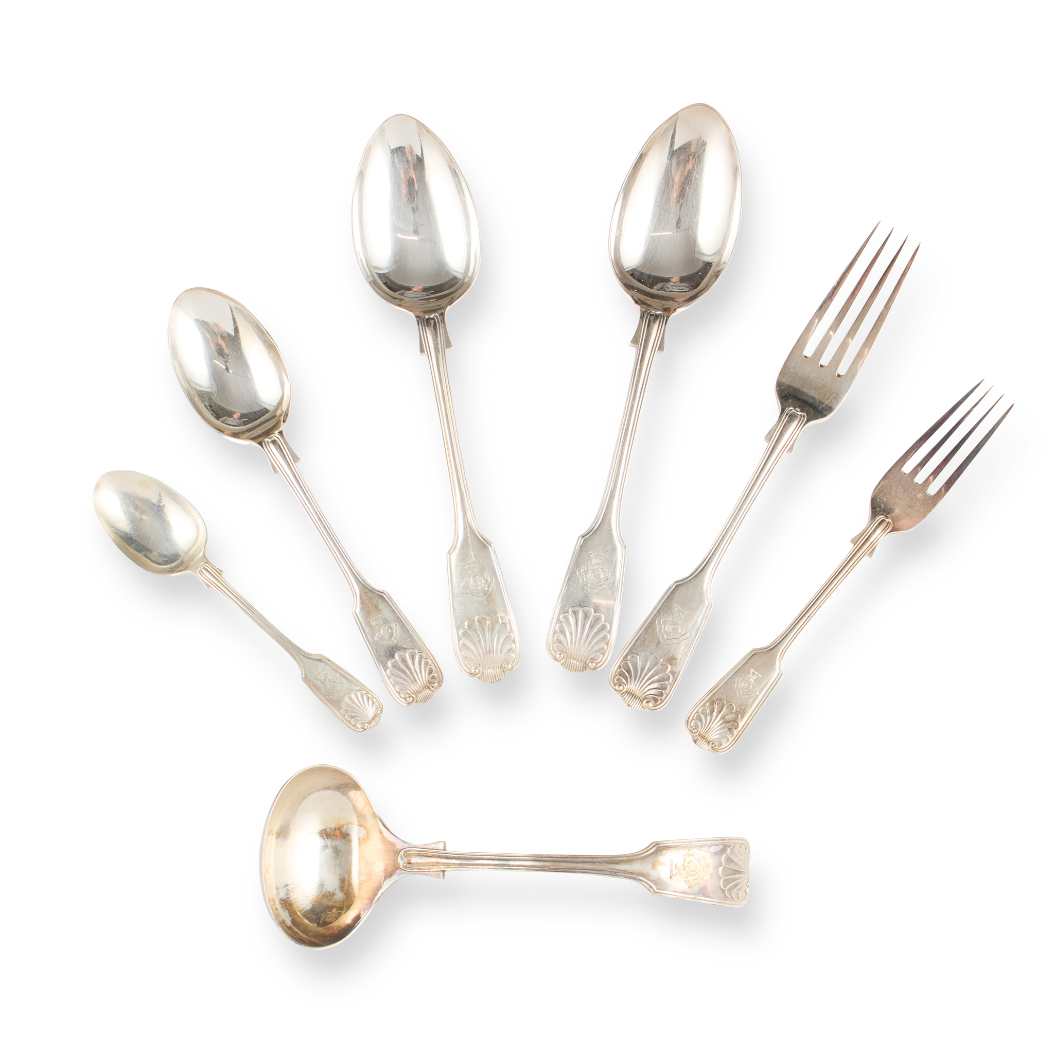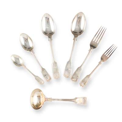 Comprising twenty-four table forks, eighteen dessert forks, twelve dessert spoons, twelve teaspoons, twenty-four tablespoons, four sauce ladles, all presented in a fitted four-drawer mahogany canteen (143)