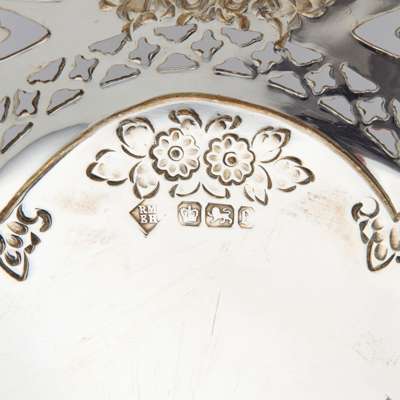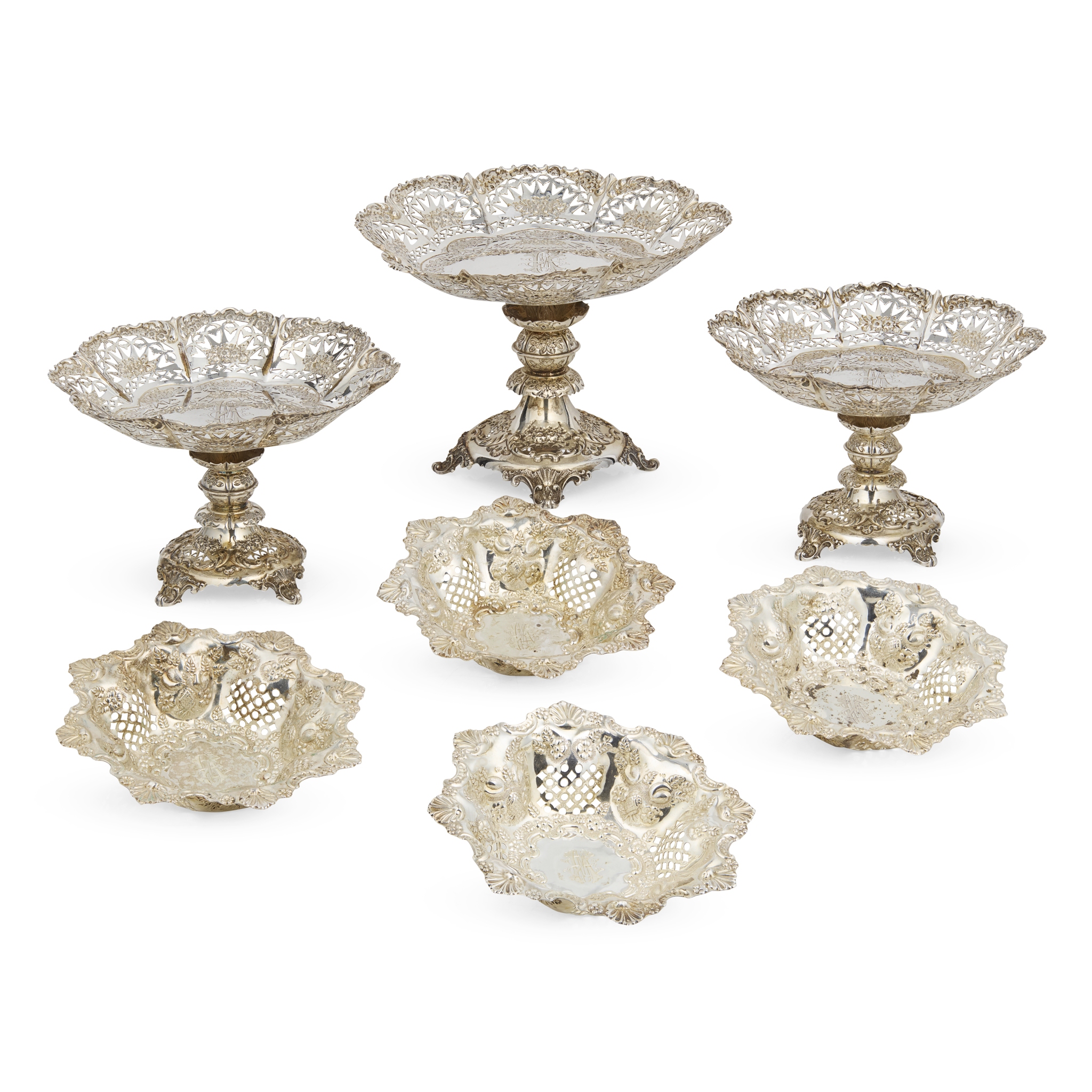 Comprising a tall comport and two smaller examples and four bon bon dishes, all with a raised scalloped and pierced border, engraved monogram to the centre, the comports each raised on a knopped stem to a domed pierced foot with four bracket shell feet, all presented in a fitted silk and velvet-lined mahogany twin-handled box retailed by Elkington & Co.