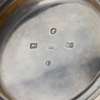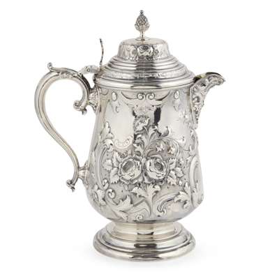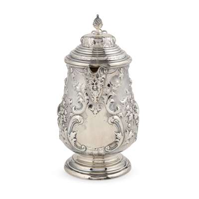 of compressed baluster form, chased floral and foliate decoration throughout, vacant oval cartouche to body, sparrow beak spout, stepped domed lid with ornate thumb-piece, pineapple finial, S scroll handle, raised on a stepped spreading foot
