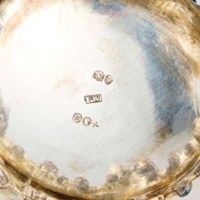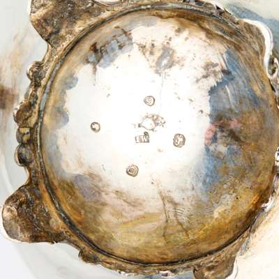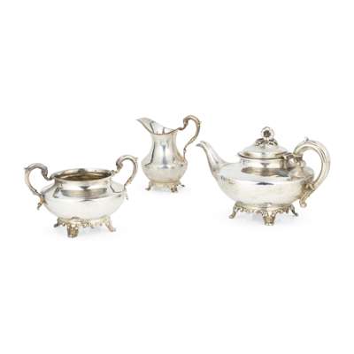 Comprising a teapot, twin-handled sugar basin and milk jug, all of circular outline, foliate clasped S-scroll handles, ivory insulators to teapot, each raised on a bracket foot with four shell clasped feet (3)