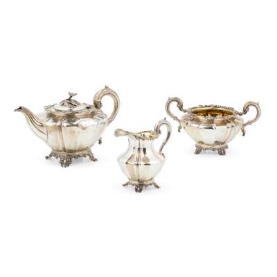 Comprising a teapot, twin-handled sugar basin and a milk jug, all of lobed form, cast floral border, S scroll handles, with ivory insert to teapot handle, the hinged lid to the teapot with budding finial, each raised on a bracket foot with four feet (3)