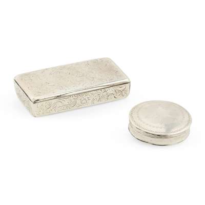 Of rectangular outline, all over engraved scroll decoration; together with a Dutch pill box, of circular outline, bright-cut engraved decoration throughout (2)