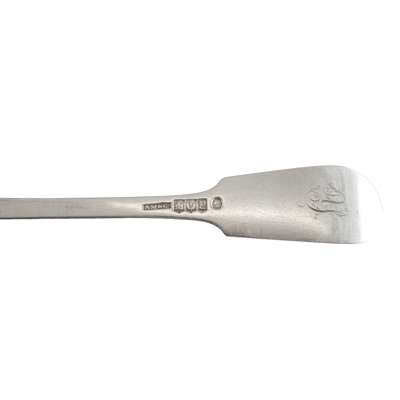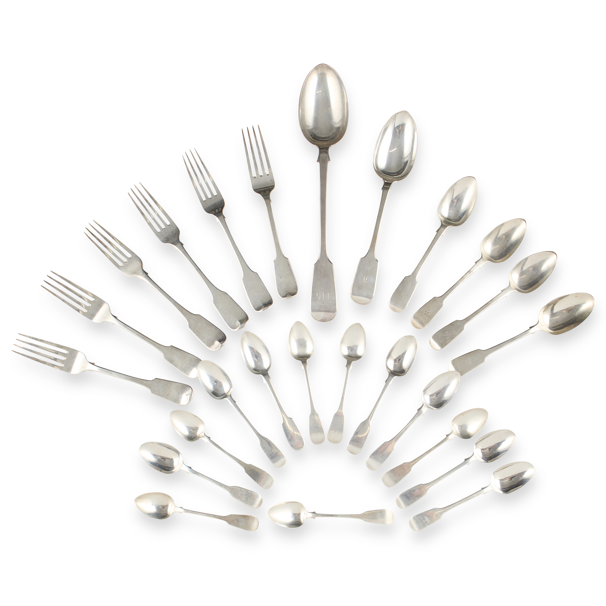 Comprising a basting spoon, H J Lias & Son, London 1867, a tablespoon Reid & sons, Newcastle 1841, six table forks, various Edinburgh makers, four dessert spoons, George Jamieson of Aberdeen and thirteen tea/coffee spoons, all of Fiddle pattern, most with engraved initial to terminal (25)