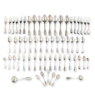 Comprising eight tablespoons, twelve table forks, fifteen dessert spoons, twelve dessert forks, eight teaspoons, a sauce ladle, toddy ladle and three condiment spoons, all of Fiddle pattern, most with engraved initials to terminal (60)