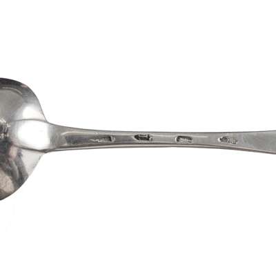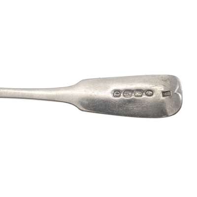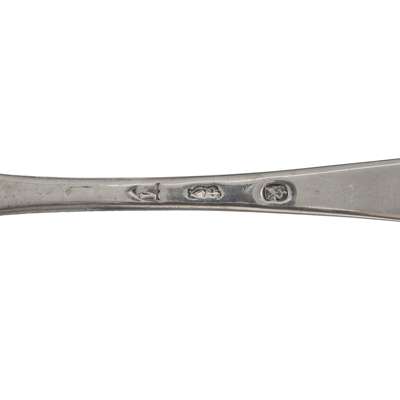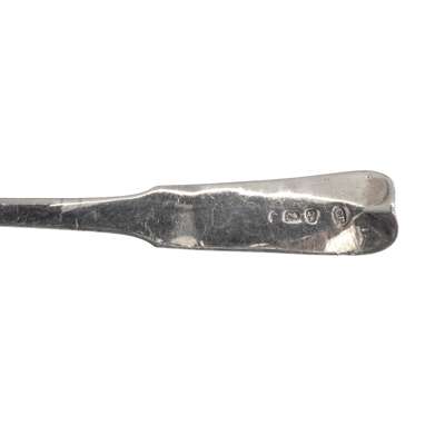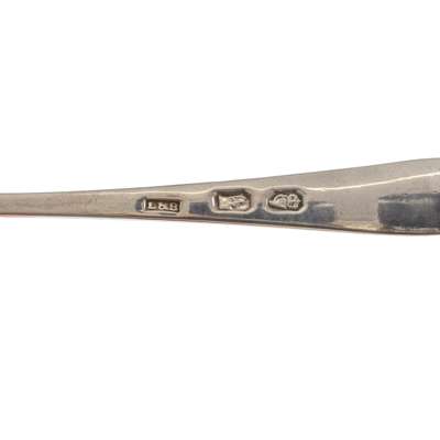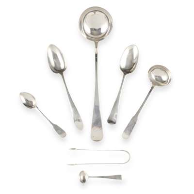 Of Old English pattern, engraved initials to terminal; together with a toddy ladle, Christian Reid, Newcastle, of Fiddle pattern, engraved initial to terminal and a pair of tongs, Newcastle; together with a collection of Irish flatware, to include, a tablespoon, Dublin 1784, of Hanoverian pattern, engraved coronet and feathers to reverse of terminal; another tablespoon of Celtic Point pattern, engraved crest and initial to terminal, a teaspoon, Dublin 1836 of Fiddle pattern, initials engraved to terminal and a condiment spoon, Dublin, of Celtic Point pattern (7)