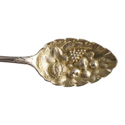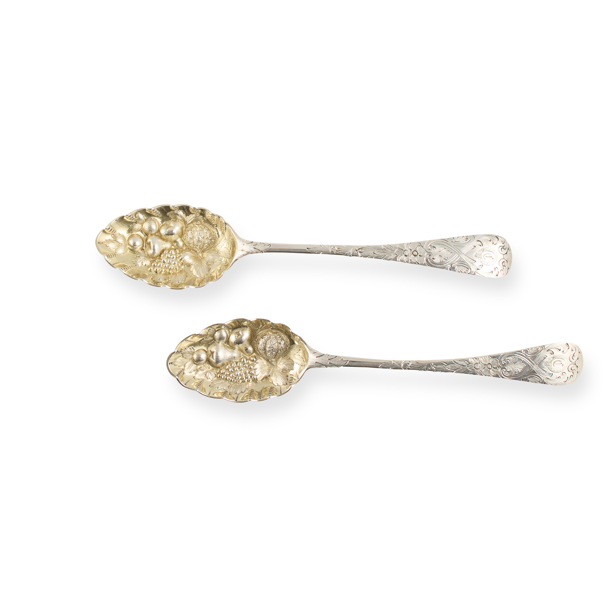 Of Old English pattern with later engraved floral and scroll decoration to obverse and reverse of stems, engraved initial within a garter to terminal, the gilt bowls with scallop edge and embossed with a display of fruits (2)