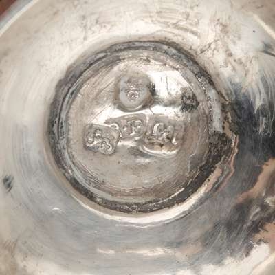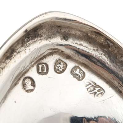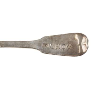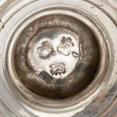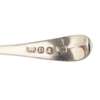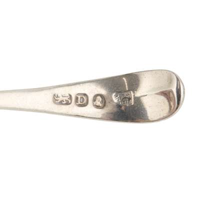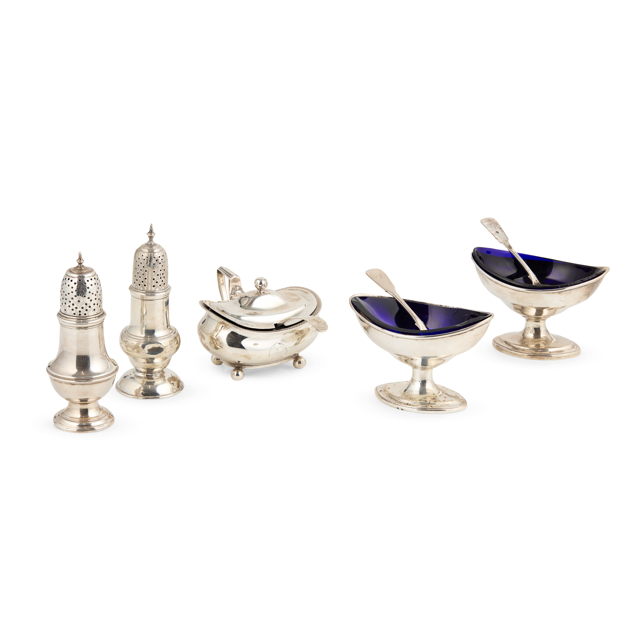 Comprising a pair of salts, JH, London 1788, each of navette boat form, raised on a short stem and navette foot; together with two associated salt spoons, PS, Edinburgh, various dates, each of Fiddle pattern, italic S engraved to terminal; two casters, London 1767 and 1742, each with a pierced pull-off lid and knopped finial; together with a mustard, Alice & George Burrows, London 1807, of bellied form, engraved crest and motto to body, gadrooned border, the hinged lid with ball finial, raised on four ball feet with an angular handle; together with an associated condiment spoon, Peter, Ann & William Bateman, London 1799, of Old English pattern, crest engraved to terminal (8)