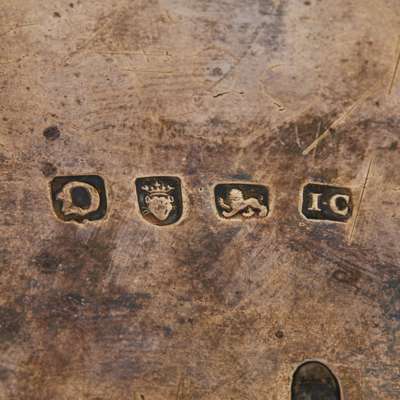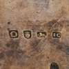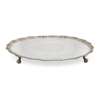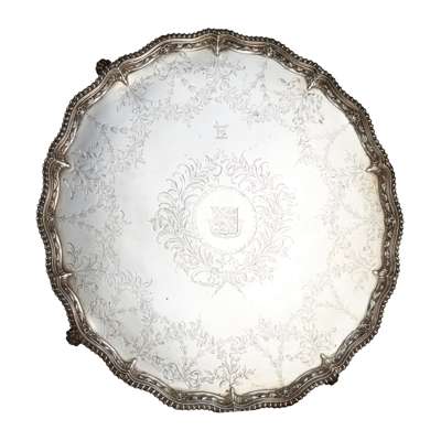 Of circular outline, later engraved floral decoration, arms for the Scarlett family engraved to the centre, with engraved crest to border, raised on four ball and claw feet, scratch weight 165:4 to the underside