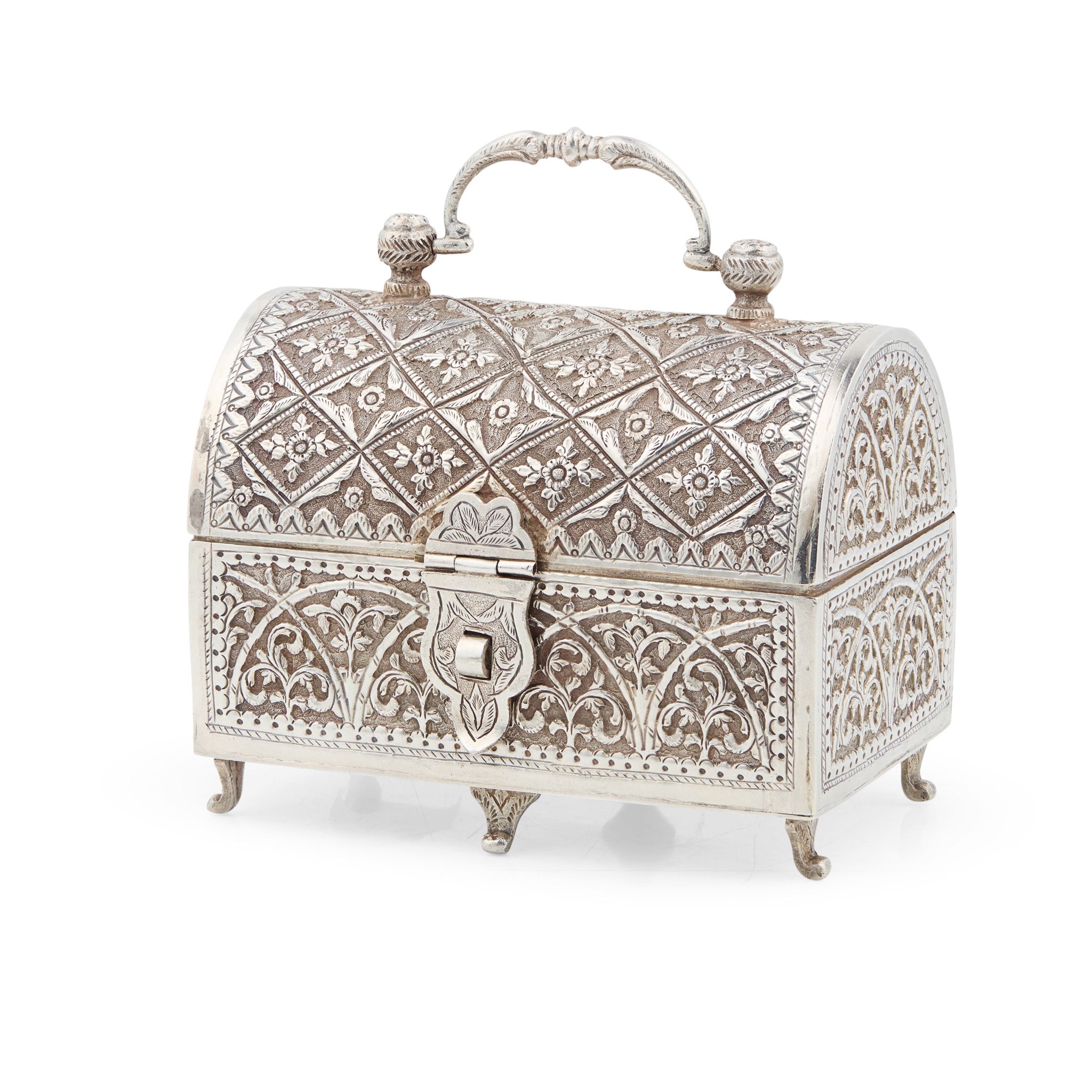 Of rectangular form, the domed hinged lid and sides all chased with varying floral and foliate designs, ornate cast swing handle, engraved lock cover, raised on six engraved bracket feet
