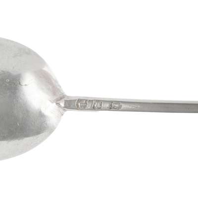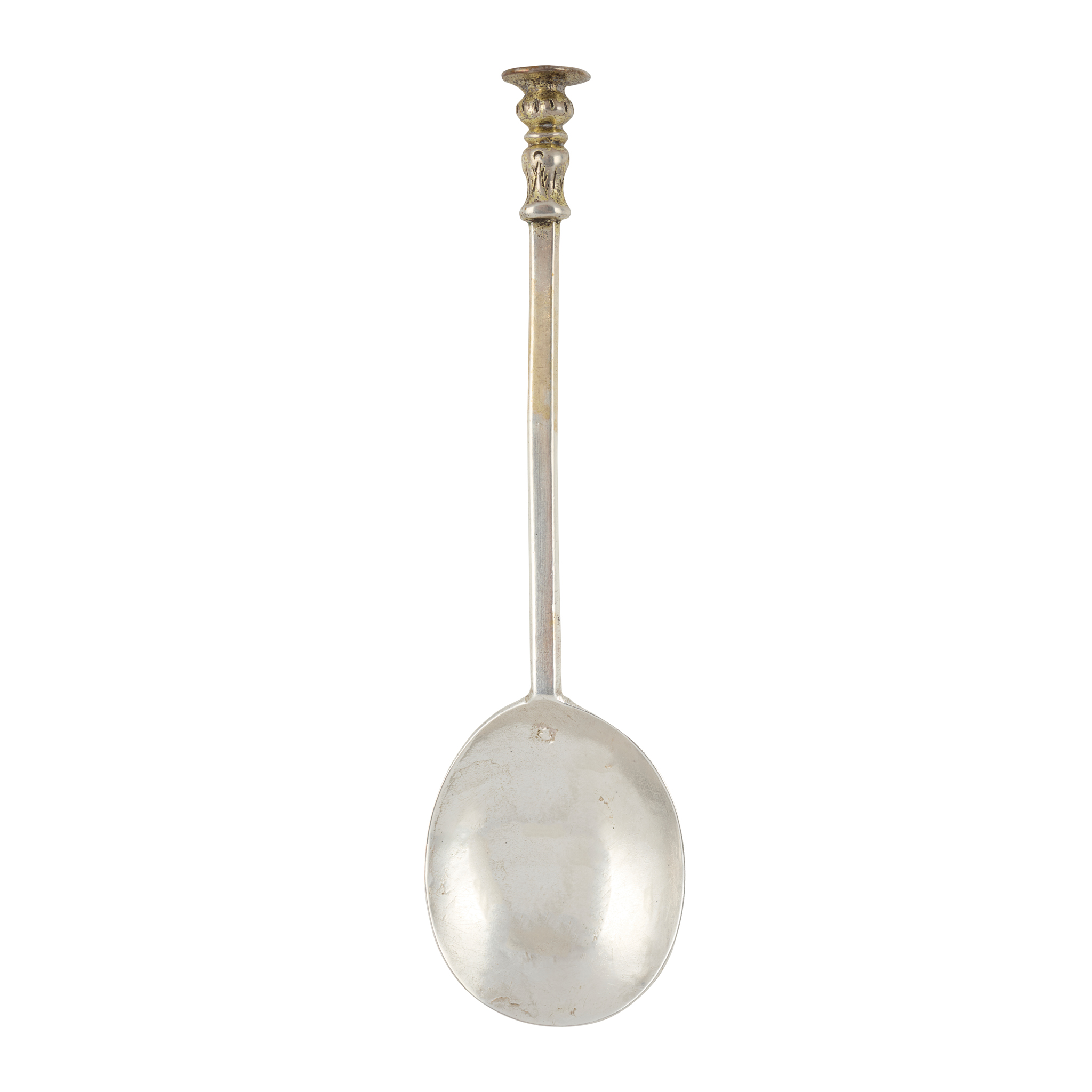 Of traditional form, with fig shaped bowl, the hexagonal stem to a parcel-gilt baluster finial with disc finial, the terminal prick-engraved FB/EG