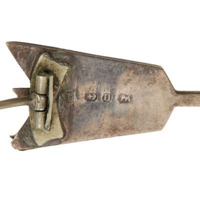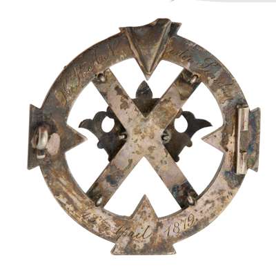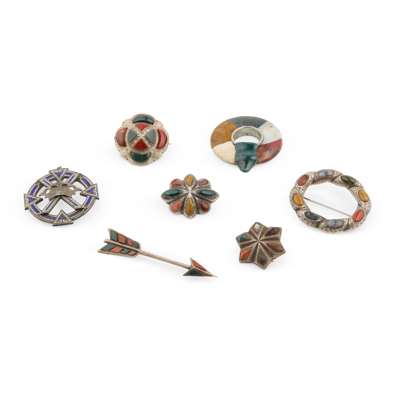 Comprising a brooch modelled as an arrow set with varying hardstone panels, two annular brooches set with varying hardstone panels, three smaller foliate-shaped brooches each set with varying hardstone panels and an annular blue enamel brooch set to the centre with a blue enamel saltire and applied crown, engraved to the reverse, ‘…13th April 1879’ (7)