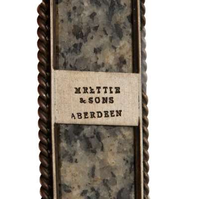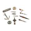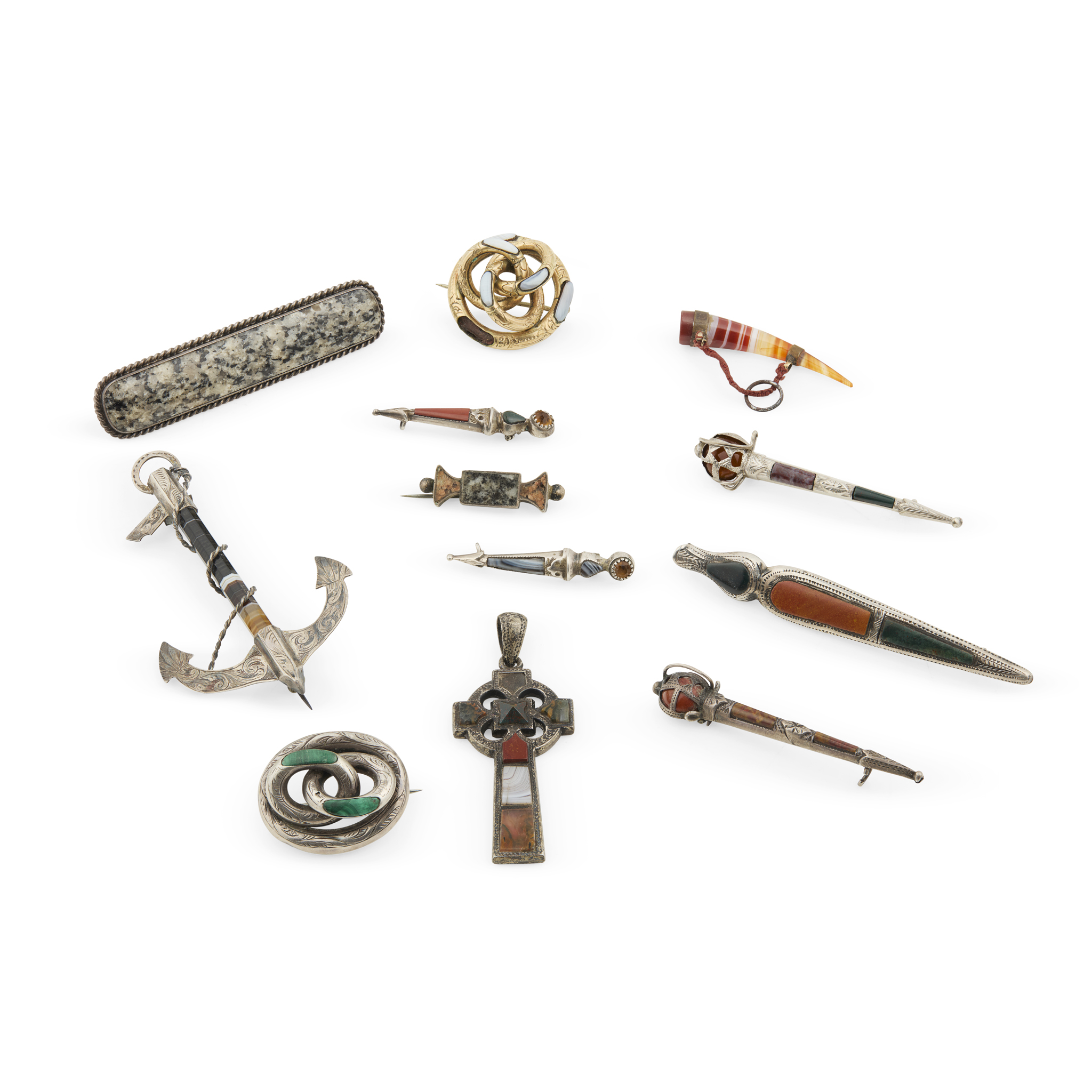 Comprising, a brooch modelled as an anchor, five brooches each modelled as varying dirks, each set with varying hardstones; an oblong granite brooch, marked 'M RETTIE & SONS ABERDEEN''; a gilt-metal interwoven knot brooch and a similar white metal, each set with hardstone panels, including malachite; together with a Celtic cross pendant set with varying hardstone panels, a bow brooch set with granite panels and a banded agate modelled as a powder horn (12)