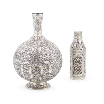 Of typical bulbous shape, lobed panels each decorated with chased foliate designs, raised on a domed foot with similar decoration; together with a flask, unmarked, of cylindrical form, chased decoration throughout of foliate and scroll design, pull-off lid (2)
