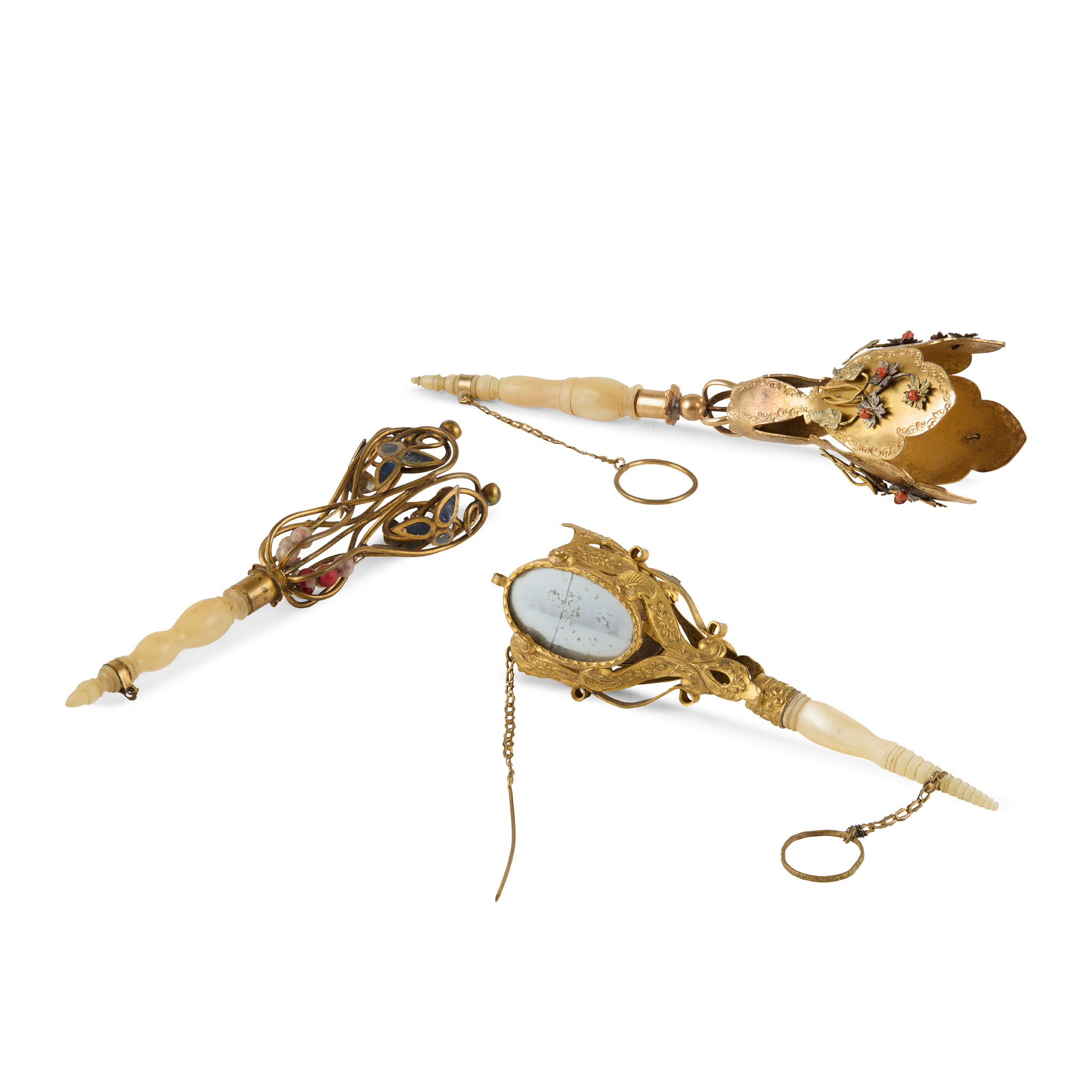The pierced stamped basket set with a mirror to each side, to a turned mother-of-pearl handle; together with another, the basket with applied filigree and coral set flowers to a turned mother-of-pearl handle and another of open-scroll work, with enamel detail, bead decoration to a turned mother-of-pearl handle (3)