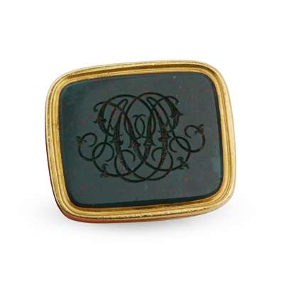 The foliate mount to a citrine matrix, engraved with the initials HJM; together with another with a fluted mount to a bloodstone matrix engraved with a cypher (2)