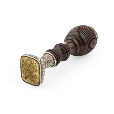The turned wooden handle of baluster form, to a fluted white metal collar with embossed foliate scroll border, the citrine matrix engraved with the arms of Emerson