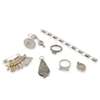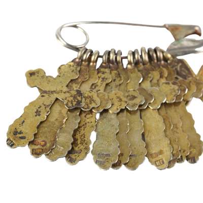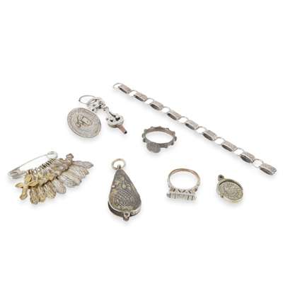 Each with a pear shaped scroll frame, the matrix engraved with monogram AC in script and stylised basket of flowers above, all within wreath of leaves; together with a small 19th century swivel seal, dated 1882, with script below; a group of twelve Russian silver gilt small crucifixes, one with Christ and decorated back, the other eleven engraved decoration on one side, 84 standard mark and various silversmiths marks; a white metal and niello decorated pendant, decorated male and female to each side, unmarked; an ecclesiastical ring engraved IHS, and on a shank with ribbed detail, unmarked; an 18th century white metal ring, with ribbed and engraved head, pierced gallery to a shank with shoulder detail and an unmarked chain (qty)