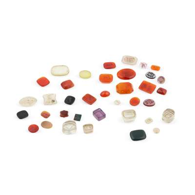 Comprising, thirteen various with crest and or motto engraved; six pictorial, including one designed as a scroll ‘A VOUS’ and another similar engraved ‘POUR LUI’; fifteen with initials/ names engraved, including one engraved Harry and one Fanny; and four vacant of various sizes (38)