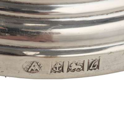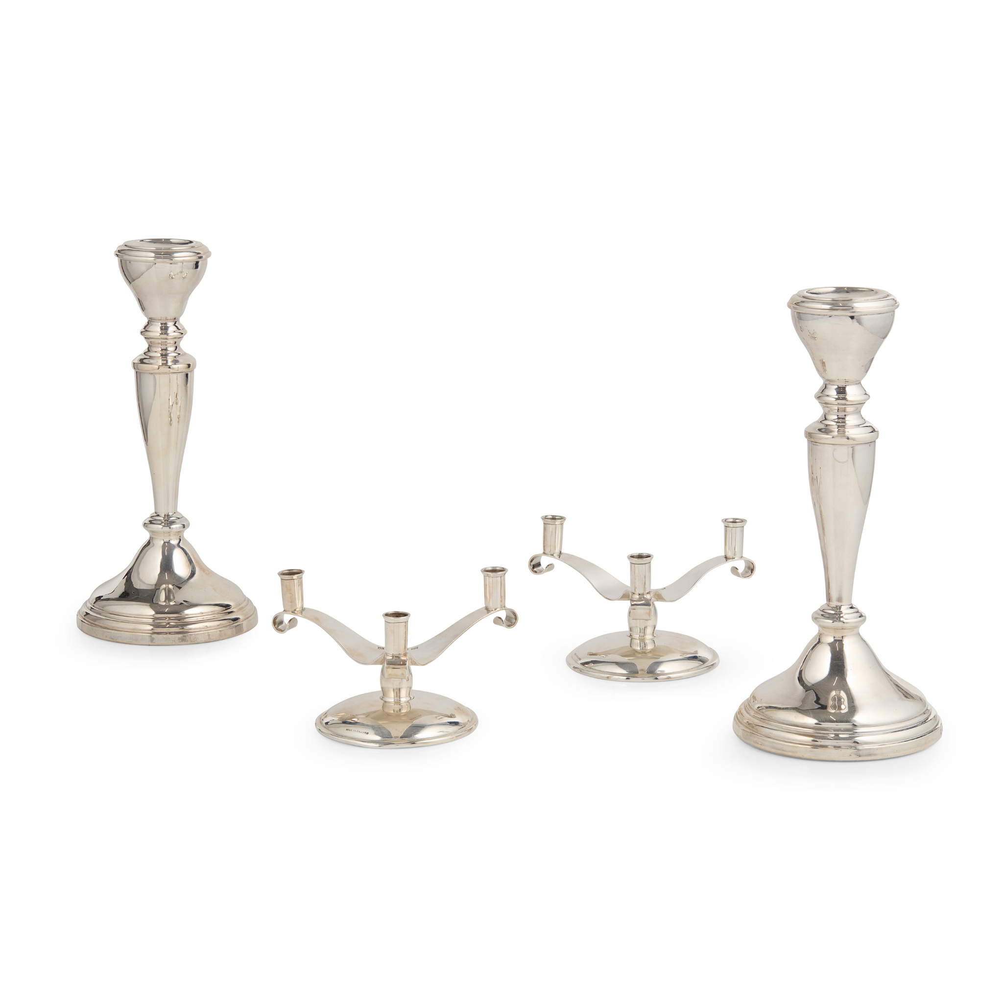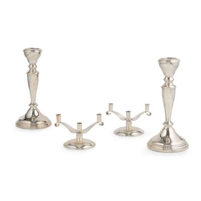 Each branch of scroll form, with simple cylindrical drip pans, raised on a slightly domed foot (loaded); together with a pair of candlesticks, Adie Brothers, Birmingham 1960, of tapered knopped form (loaded) (4)