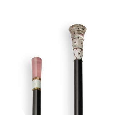 The flared terminal of pink guilloché enamel with pink bow and floral decoration, the border set with a row of pearls, to a silver collar, and tapered ebonised stick; together with another, the flared rock crystal terminal set in a harlequin pattern of collet set rubies, the white enamel collar also set with rubies in a similar fashion, to a tapered ebonised stick (2)