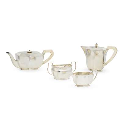 Comprising a water pot, teapot and milk jug, all of elongated octagonal form, engraved geometric border, angular ivory handles and finials, each raised on an octagonal foot; together with a silver-plated twin-handled sugar basin (4)