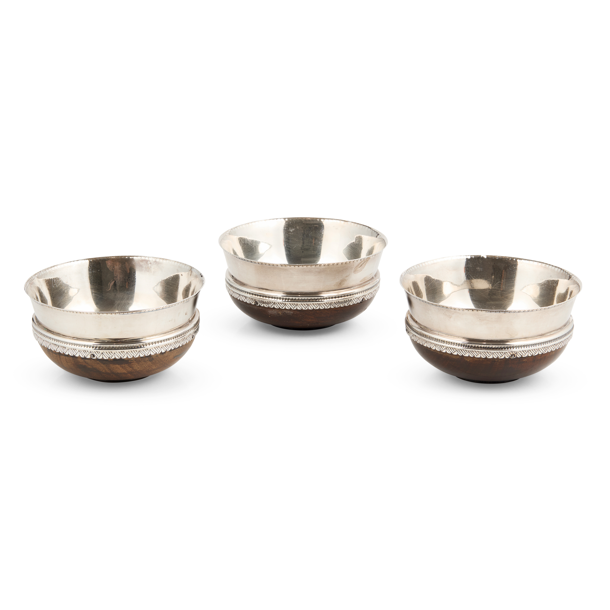 Each of rounded circular form with a slightly everted silver mount and lining, foliate border and chased edge, to an oak bowl and foot (3)