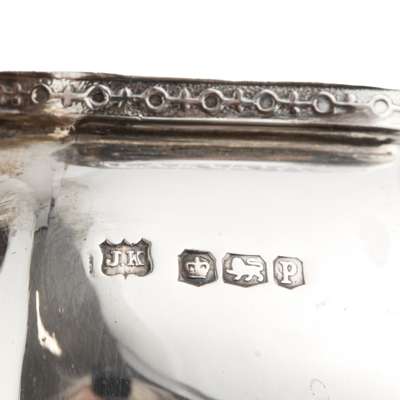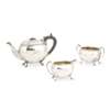 Comprising a teapot, twin-handled sugar basin and a milk jug, all of octagonal outline, stylised border, C-scroll handles, engraved Gothic B to body, each raised on four hoof feet (4)