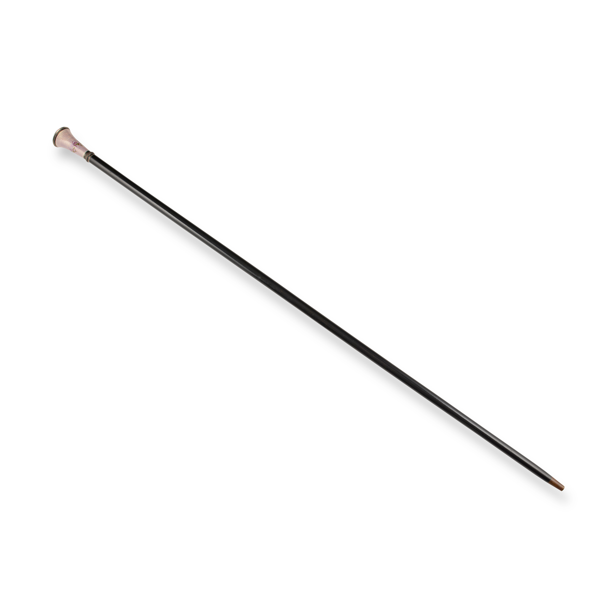 The rose quartz tapering terminal set with an old-cut diamond, to a gold and white enamel collar to a tapering cane