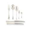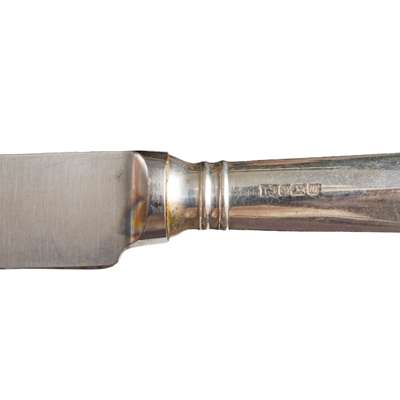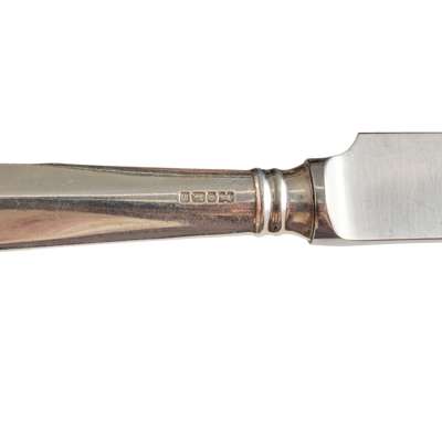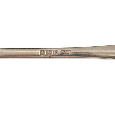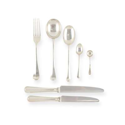 Comprising twelve soup spoons, Mappin & Webb, Sheffield 1930 and two by Martin Hall & Co., Sheffield 1915, three dessert spoons, four table forks, Brook & Son, Edinburgh 1930 and six by William Hutton and Sons, Sheffield 1938, all of Hanoverian pattern; together with a collection of four teaspoons and two salt spoons with twisted stems; together with twelve silver-handled table knives and six silver-handled side knives, Sheffield, all contained in a mahogany three-drawer canteen (51)