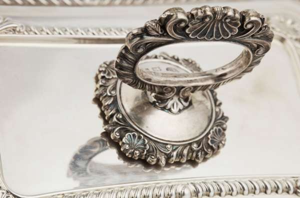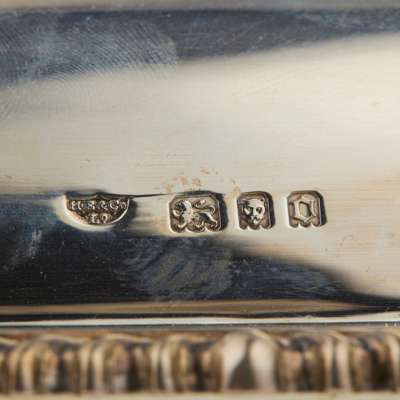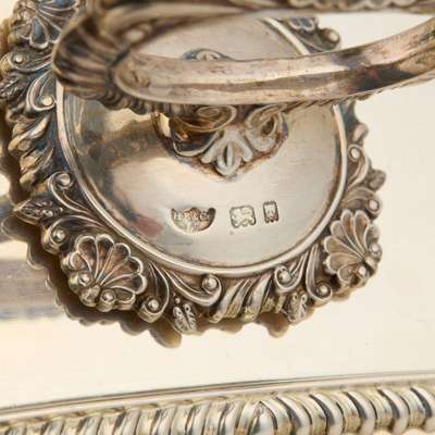 Each of rounded rectangular form, gadrooned border with shell corners, the loop handle of similar decoration (2)