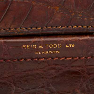 comprising silver-mounted bottles, manicure set, a button hook, shoe horn, mirror, brush etc., all with engine turned decoration and foliate border, presented in a fitted crocodile skin case, retailed by REID & TODD LTD GLASGOW