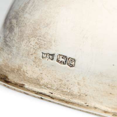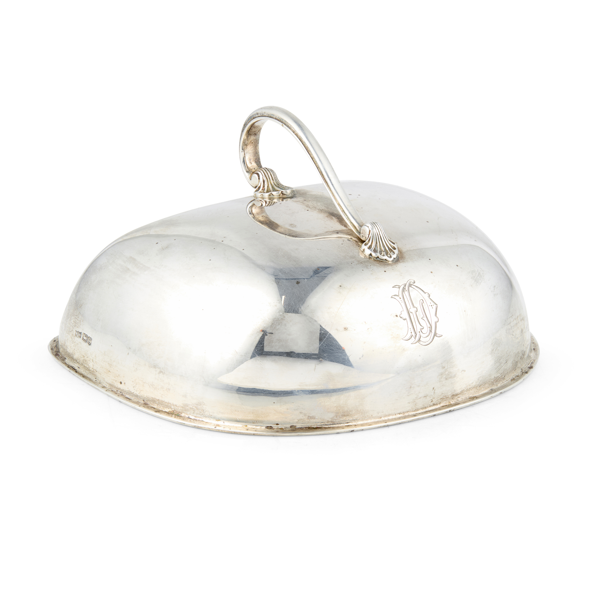 Of domed form, shell clasped loop handle, engraved monogram to body