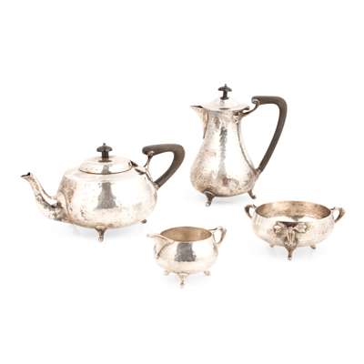 Comprising a teapot, water pot, thrice-handled sugar basin and a milk jug, all of planished finish, the bi-furcated handles with foliate terminals, each raised on three plain feet (4)