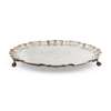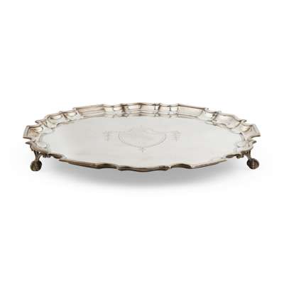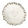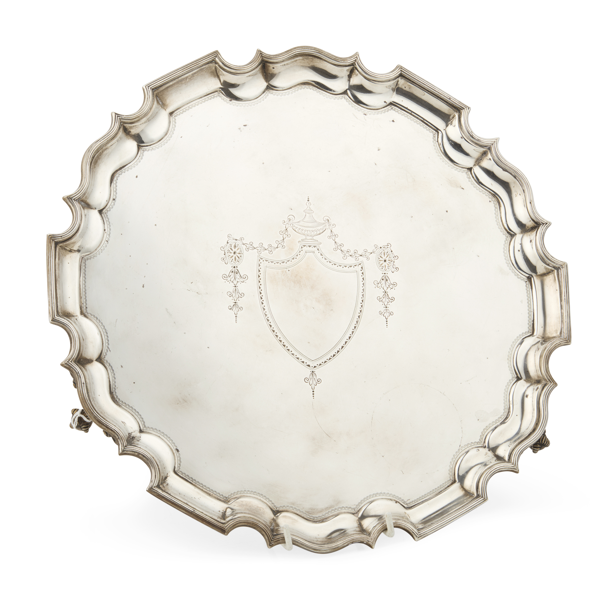 Of circular outline with a pie-crust border, engraved vacant shield cartouche in a swag garland border to centre, raised on three ball and claw feet
