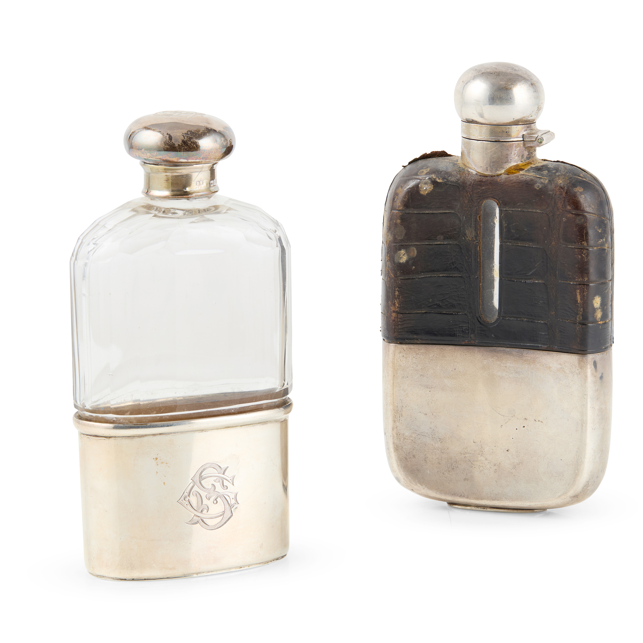 Of traditional form, upper leather slipcover, with pull-off silver cup; together with another, Drew & Sons, London, 1900, the body formed of cut glass, the simple pull-off cup engraved with monogram GS (2)
