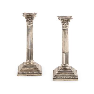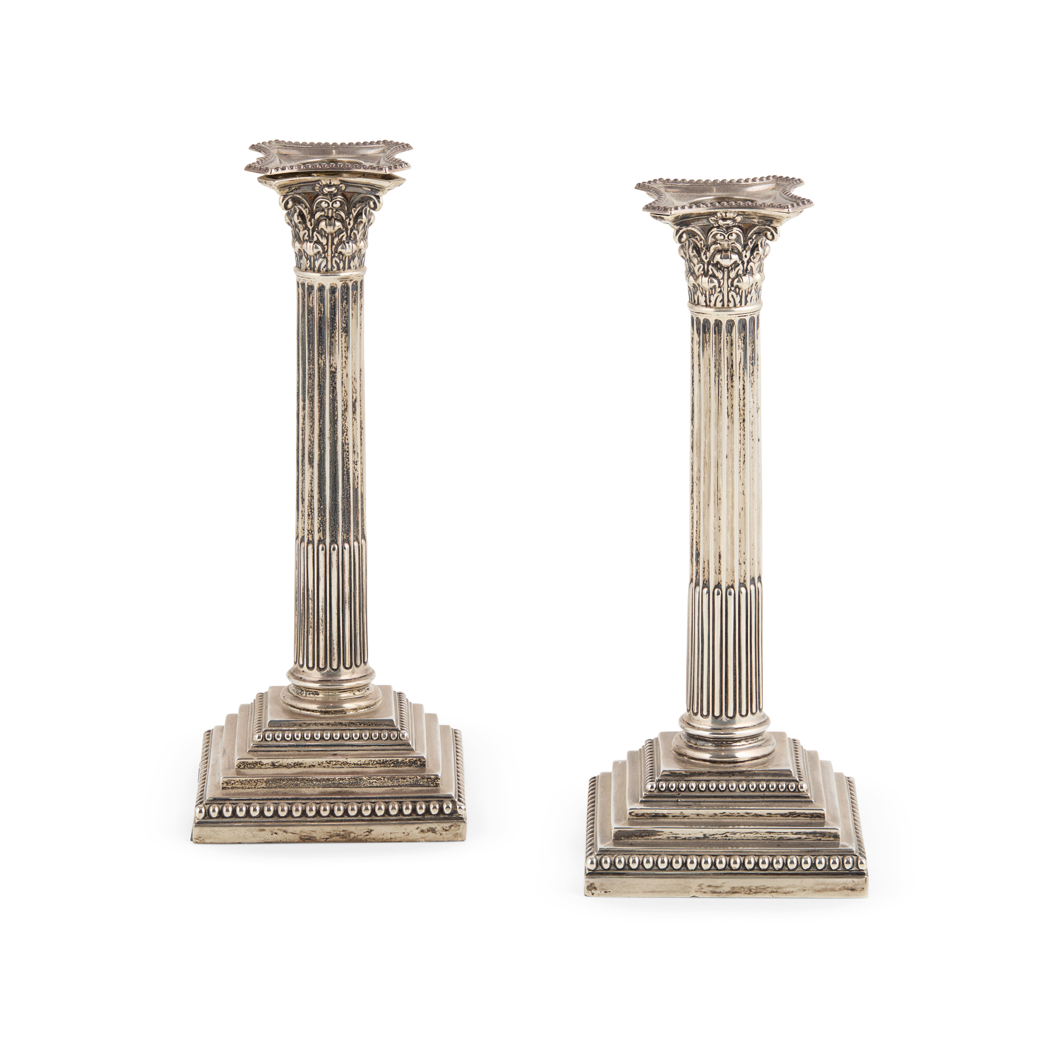 of Neo-Classical form, the Corinthian column to a sweeping square base with beaded detail, the removable sconces with similar beading (loaded) (2)