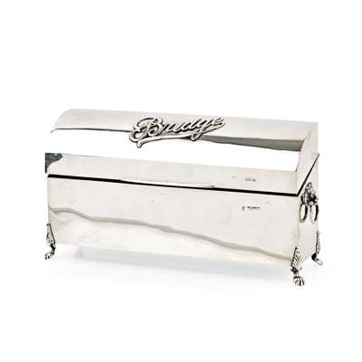 The plain box with an arched hinged lid with applied label ‘Bridge’, lion mask loop handles to the sides and raised on shell cast paw feet; the compartmented interior lined in boxwood