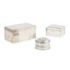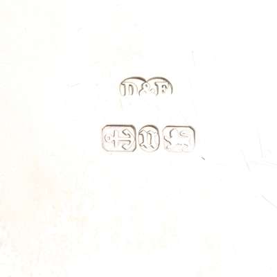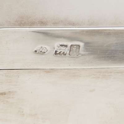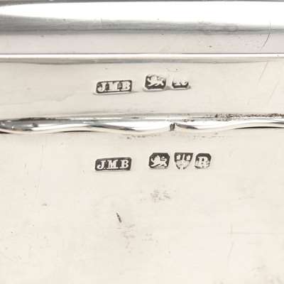 Of traditional form, engraved inscription to the hinged lid ‘John, from his wife. 1st July 1904’, gilt interior; together with another smaller cigarette box, John Millward Banks, Chester 1900, wooden lined; and a dressing table box, Deakin & Francis Ltd, Birmingham 1894, of circular outline, the hinged lid and sides chased with floral and scroll decoration, to a gilt interior (3)