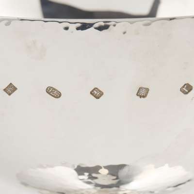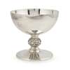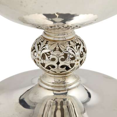 The deep bowl of hammered finish, to a knopped pierced stem with foliate and scroll motifs, to a circular foot