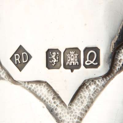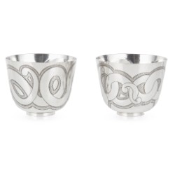 The deep bowls, each chased with Celtic scroll motifs to a planished ground, raised on a circular foot (2)