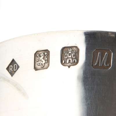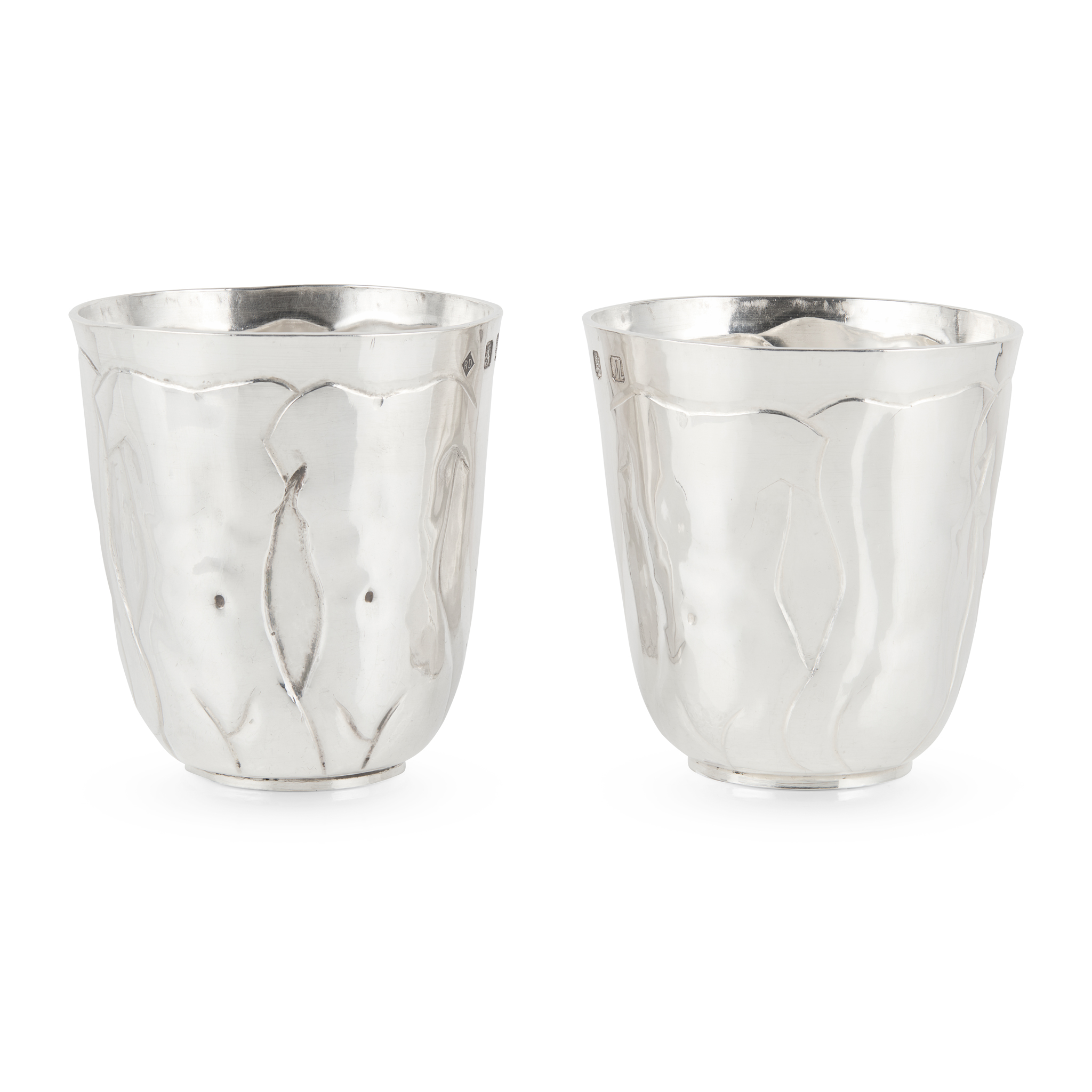 Each of slightly tapered form, chased with two pairs of nude forms, raised on a circular foot
