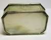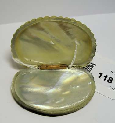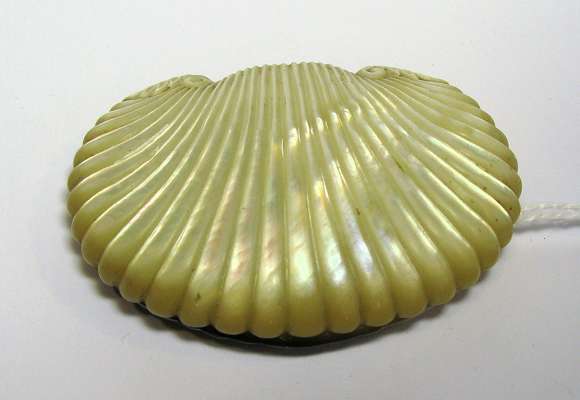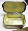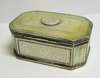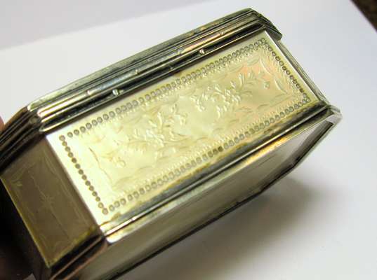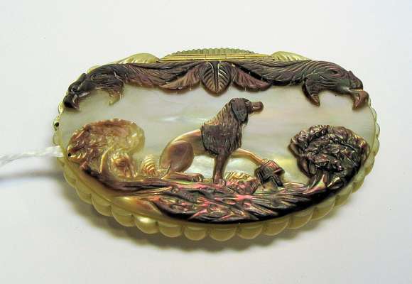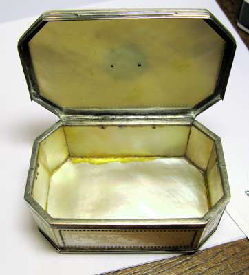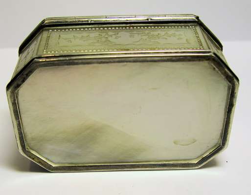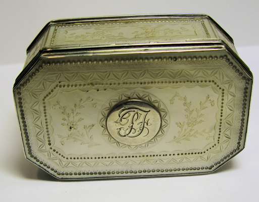 apparently unmarked, of canted rectangular form, silver mounted with a central medallion monogrammed PJ, incised with floral motifs and dot borders; together with another, apparently unmarked, in the form of a shell, the lid carved in relief with a sitting dog with an upturned basket