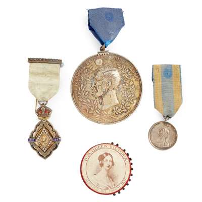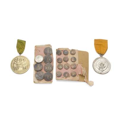 silver, unnamed as issued; together with a Masonic 1897 Diamond Jubilee medallion marked Kenning London, a commemorative pin cushion and Great Exhibition medallion together with various ribbons; two Victorian miniatures with bars; Edwardian belt buckle; two groups of buttons for the Stanhope Family Livery, seven large, eleven small, etc.