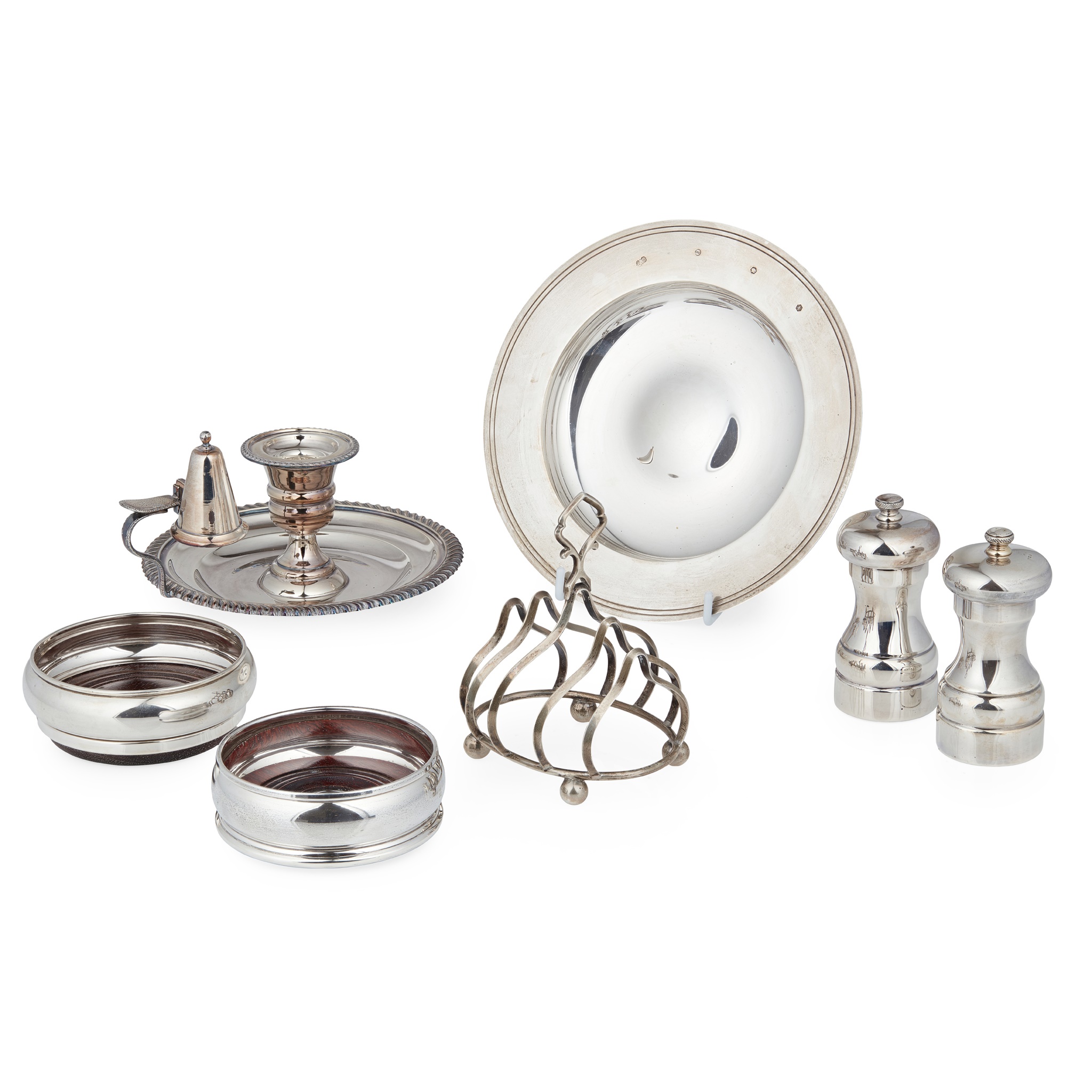 to include, a modern reproduction of an Armada dish, William Comyns & Sons, London 1997, of traditional form with feature hallmarks; together with a chamber stick and snuffer, Mappin & Webb, Sheffield 1985, with a gadrooned border; a matched pair of modern wine coasters, with turned wood bases; a toast rack, Birmingham 1906 and a pair of modern salt and pepper grinders