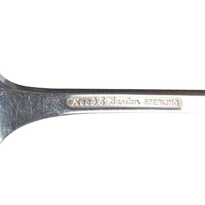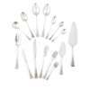 Reed & Barton, stamped STERLING, comprising, two tablespoons and a slotted spoon, twenty-four glacé spoons, twelve dessert spoons, twenty-four dessert forks, twelve table forks, twelve of each side and table knives, a large and small serving knife, a serving fork, a cream ladle and two small spoons and a small fork, all of cast scrolling pattern; together with an unassociated unmarked spoon