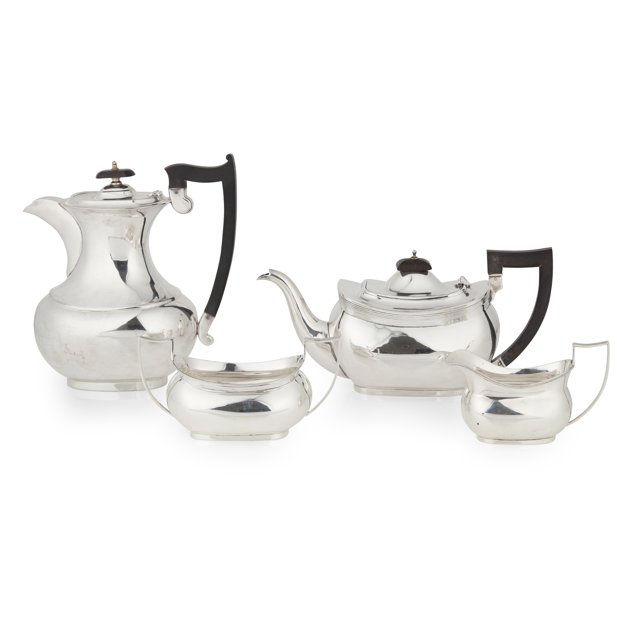 Barker Brothers Silver Ltd, Birmingham 1934, comprising teapot, twin-handled sugar basin and a milk jug, all of baluster oval form, with a threaded everted rim, angular handles, raised on an oval foot; together with a similar water pot, Viner's, Sheffield 1925, with engraved crest and motto to body
